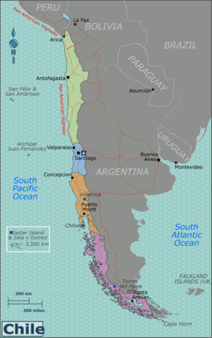 Chile se extiende estrechamente a lo largo de la mitad sur de la costa oeste de América del Sur, entre los Andes y el Océano Pacífico. Los países limítrofes son Perú al norte, Bolivia al noreste y Argentina al este. Chile tiene más de 5.000 kilómetros (3.100 millas) de costa sobre el Océano Pacífico Sur.
